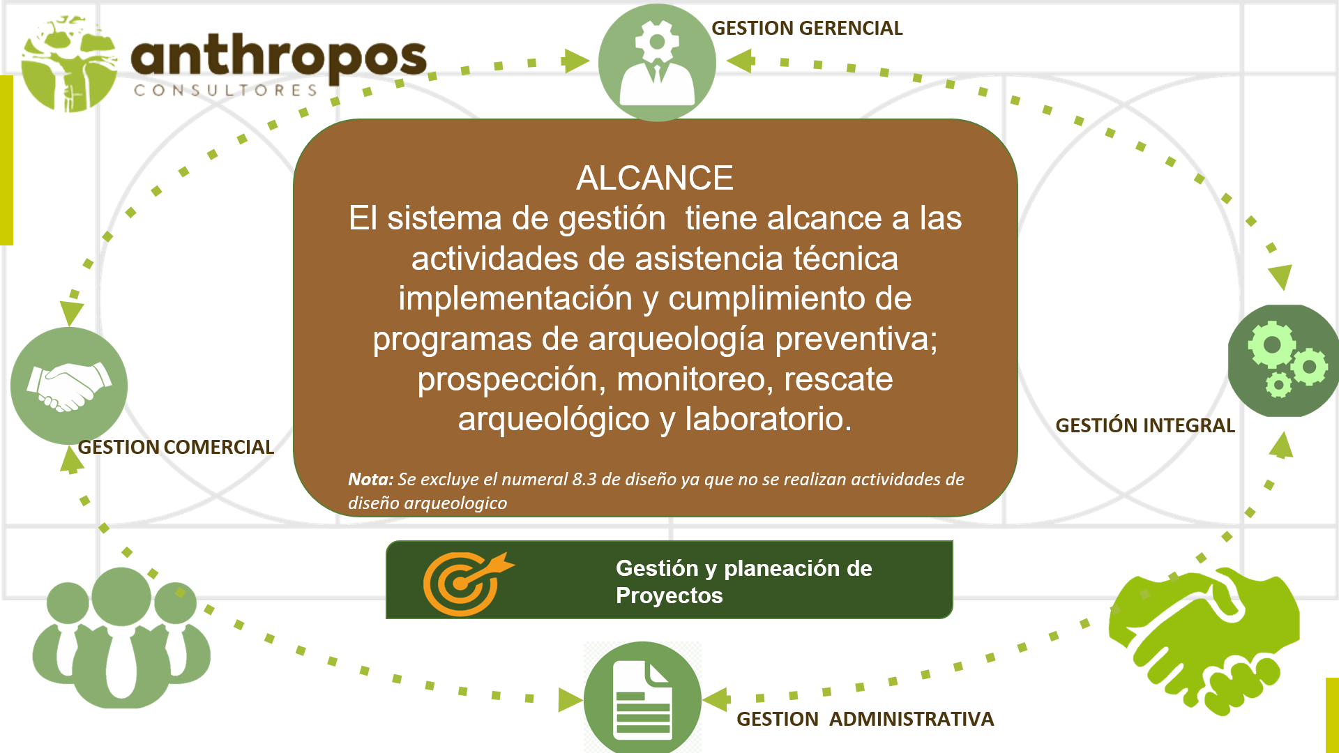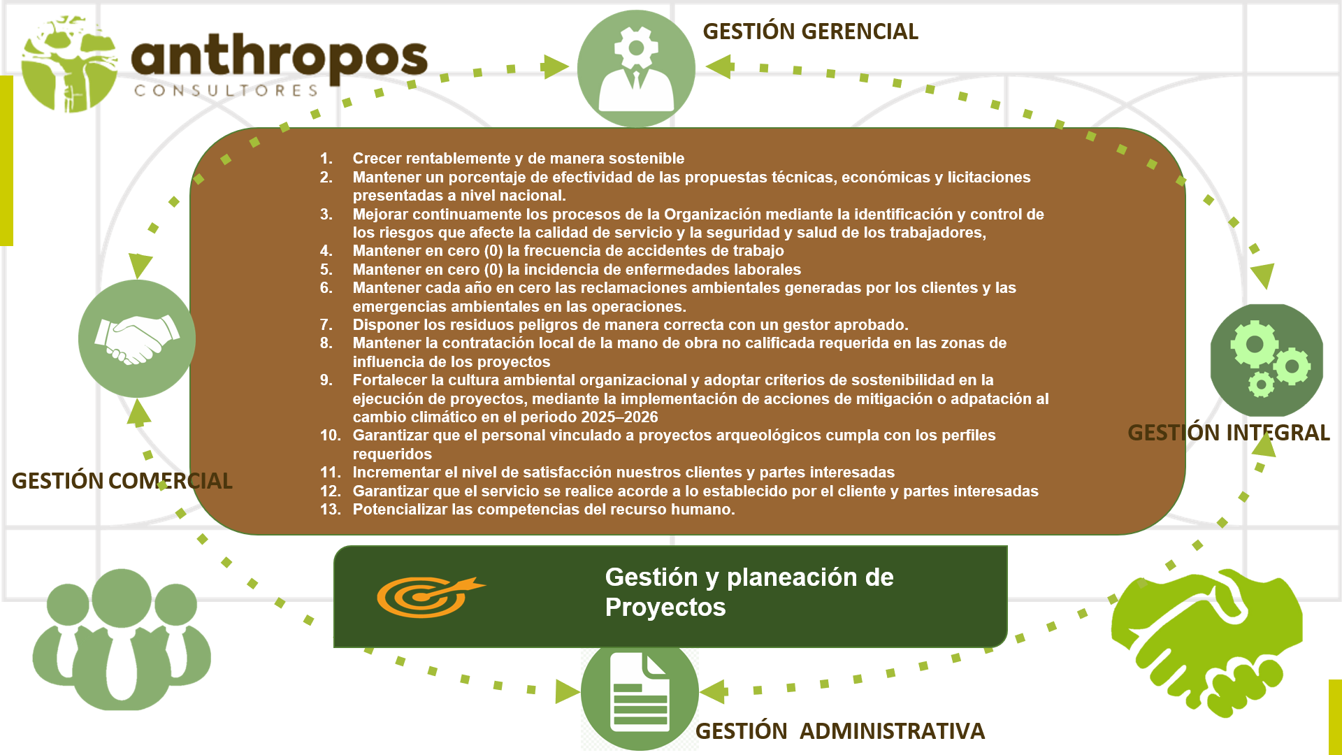 En ANTHROPOS S.A.S., empresa especializada en consultoría arqueológica y en la protección del patrimonio arqueológico de la Nación, estamos comprometidos con el desarrollo y fortalecimiento del Sistema de Gestión Integral conforme a los lineamientos de las normas ISO 9001, ISO 14001 e ISO 45001. Esta política define los principios que guían nuestra actuación y establece los siguientes compromisos